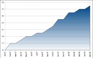 Here’s a sad truth. It takes a really, really, long time to adopt a child from China. Below is a graph that I’ve compiled with data from our adoption agency, CCAI. It graphs the number of months that couples have waited for their child from January 07 to May 08.